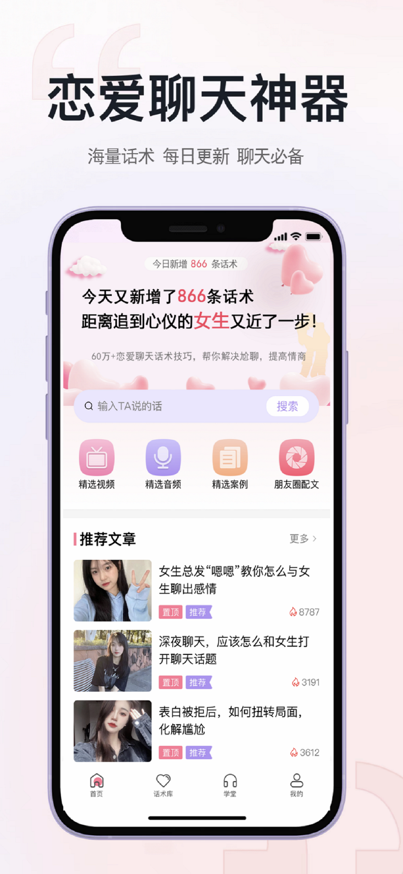 是一款拥有几十万可搜索的恋爱聊天话术、聊天技巧、聊天话题、表白技巧,全场景覆盖、持续更新。
